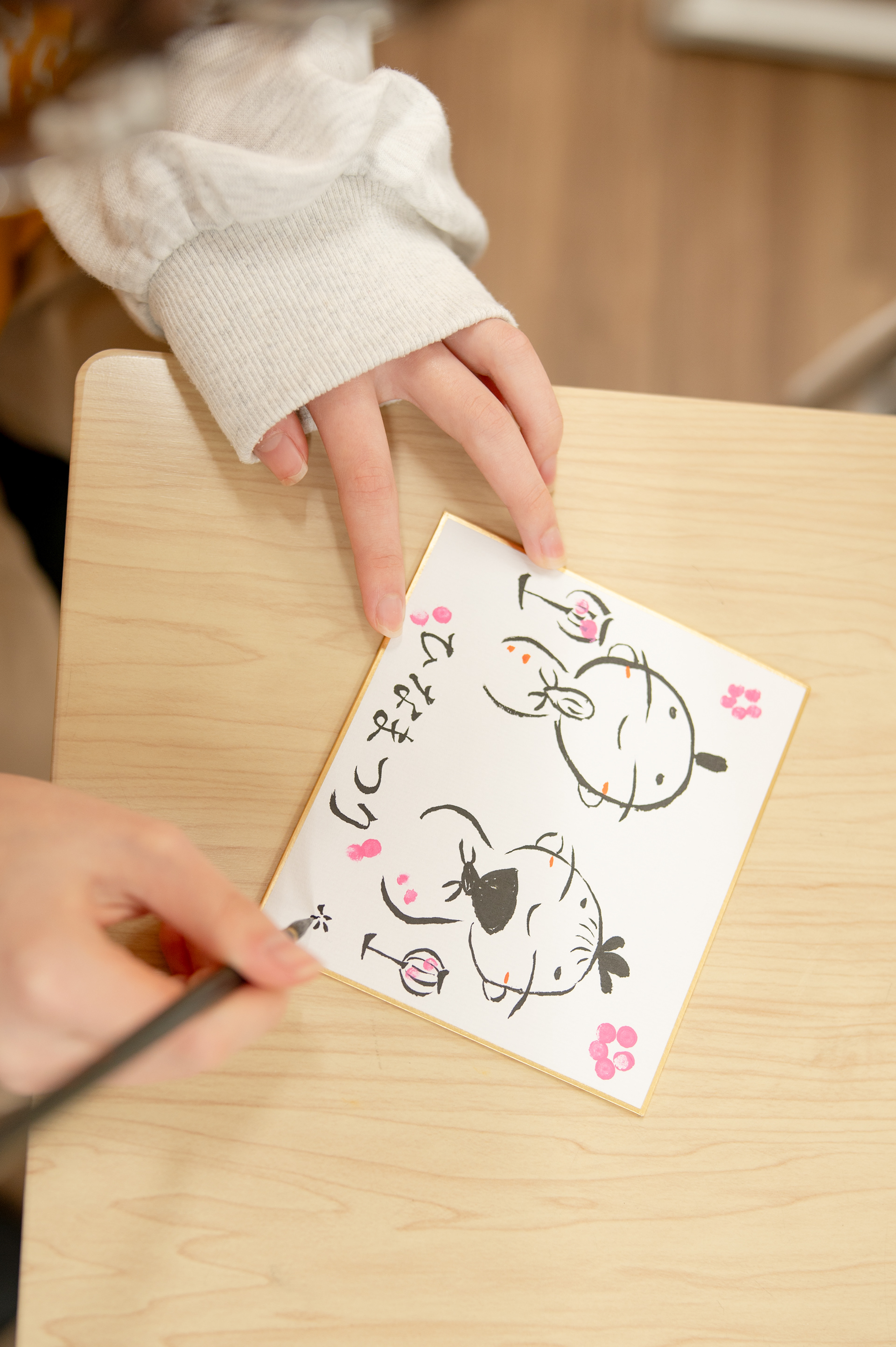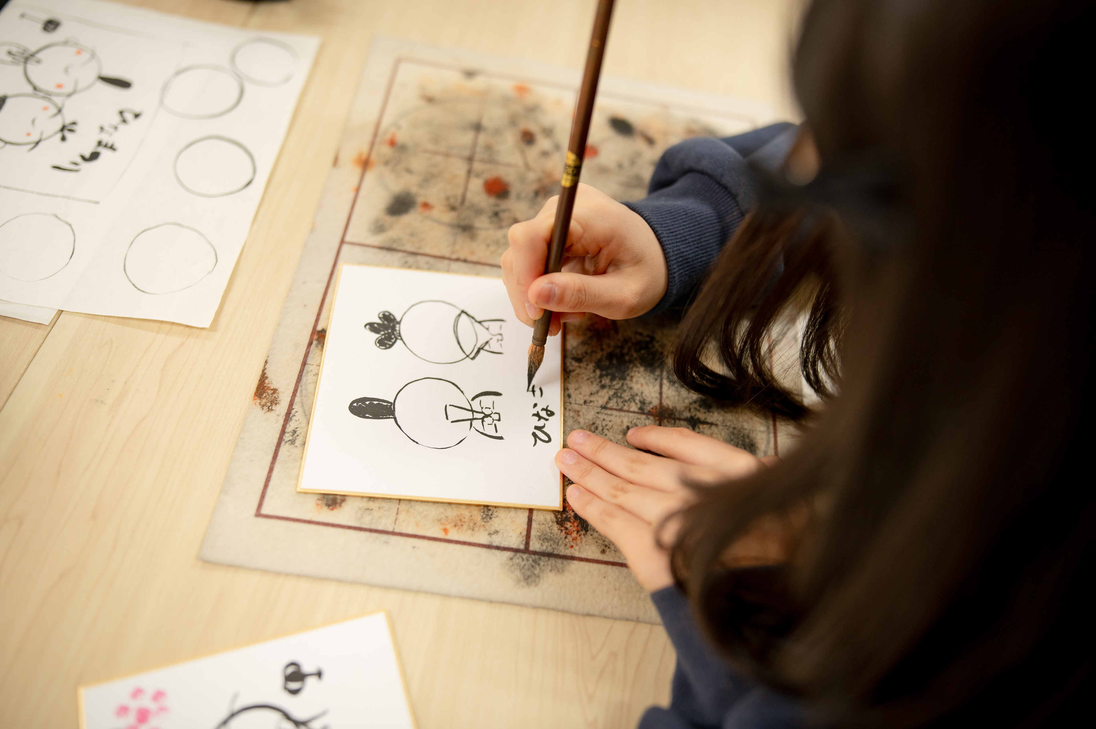 細い線で丸を書くには、筆を立てて持たないといけません。子供たちにとってはお遊びの一貫だったかもしれたせんが、実は細い字を書くいい練習になっていました☺️